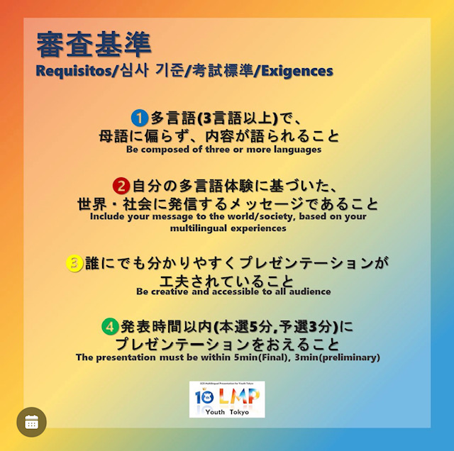 今年度で10年目を迎える3言語以上の多言語でスピーチする大会(LMP~LEX Multilingual Presentation for Youth Tokyo)が、11月26日(日)10-18時で、予選がYou-tubeで無料で、どなたでも見ることができます。ぜひ、ヒッポ育ちの多言語人間のスピーチや、日本に来ている留学生たちなどのスピーチを聞いて下さいね。本選は、来年、渋谷LINE CUBEであります!