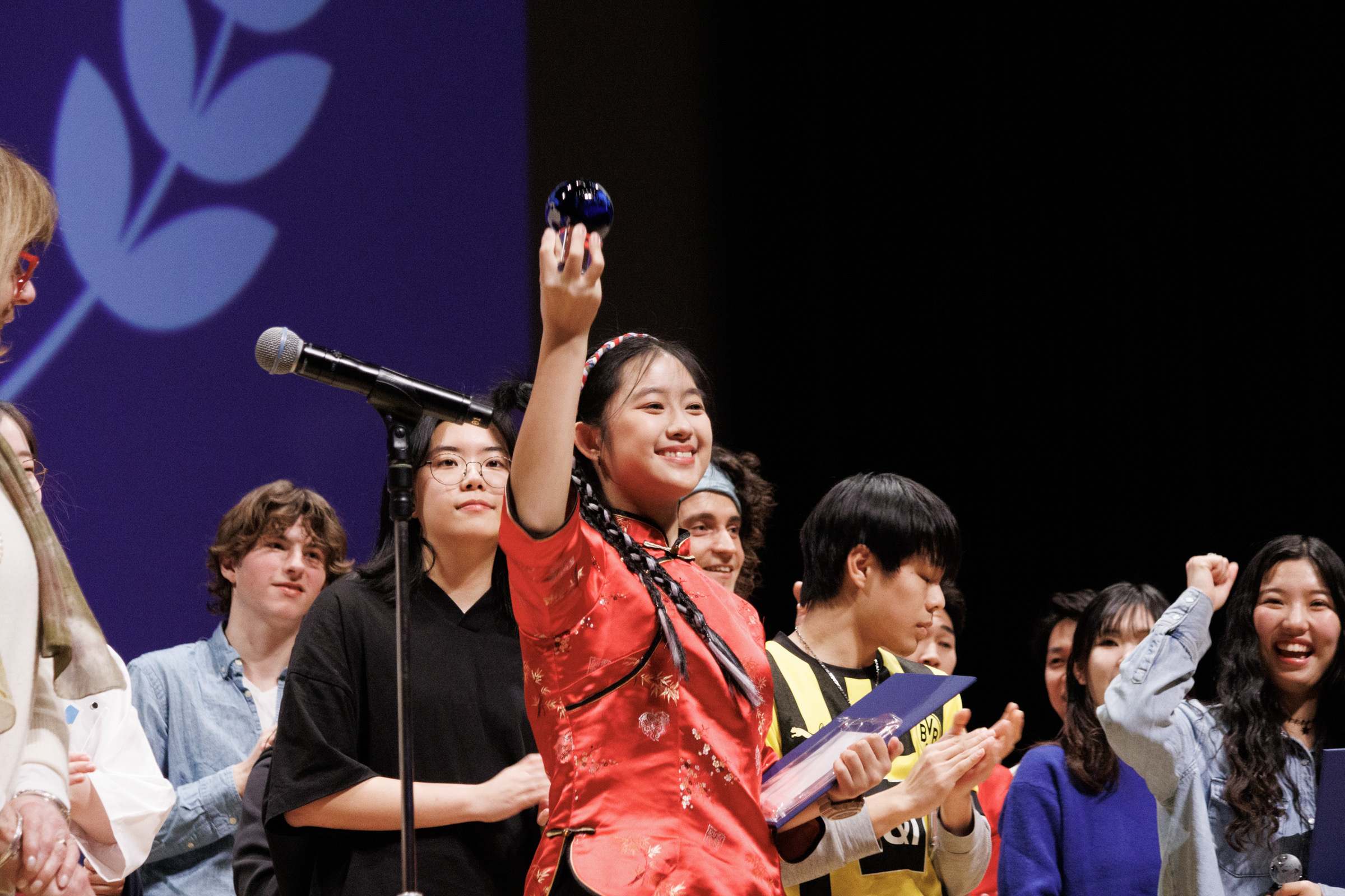 ズームでずっと練習していたので、大きな舞台で大丈夫かな?と心配していたのですが、演劇や歌劇を小さい頃からしているということで、すごく舞台慣れしていて、スピーチも堂々たるものでした。メンバーのみんなで、何も治すところがなく、明日が楽しみ!と言ってもらって、次の日。