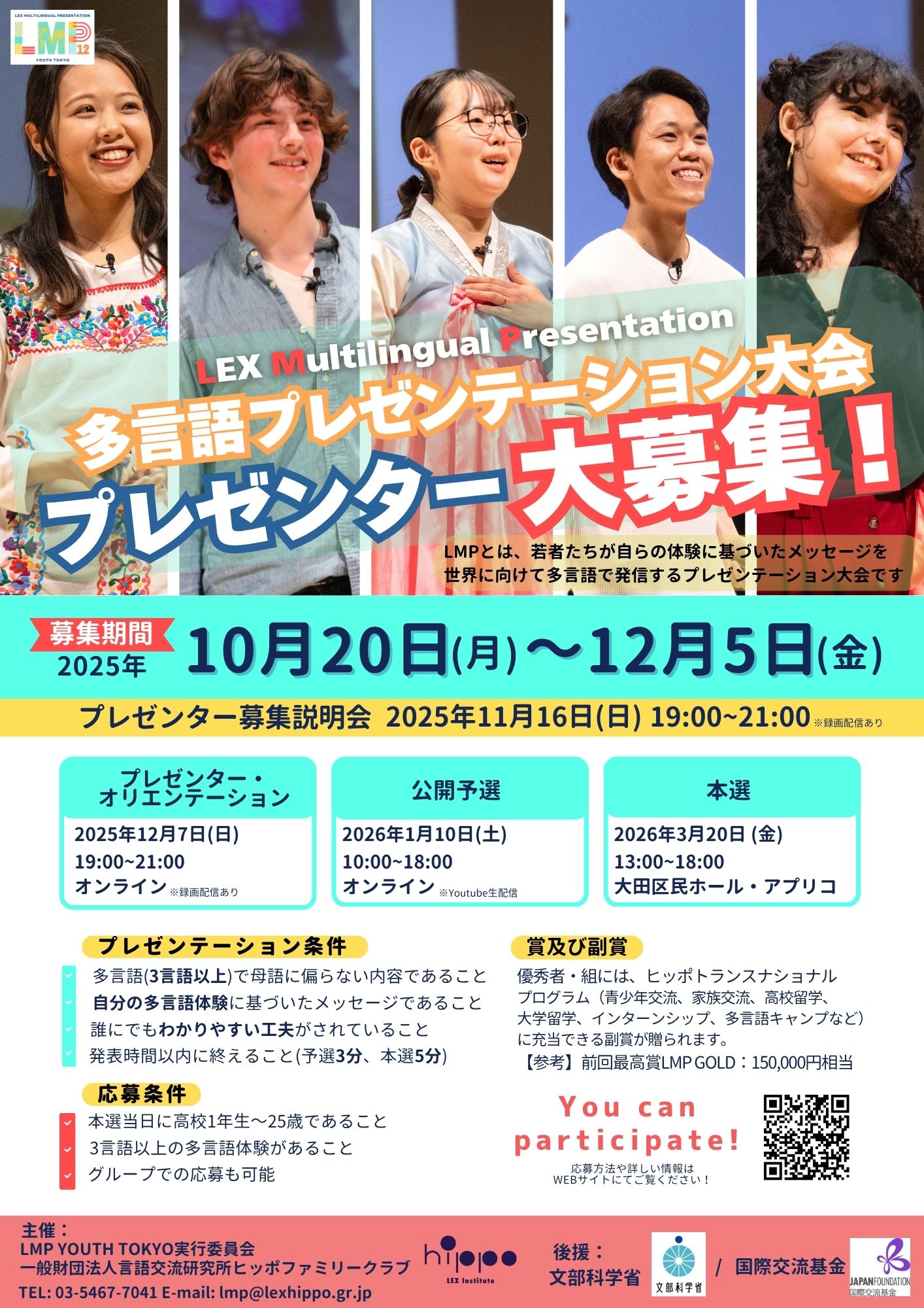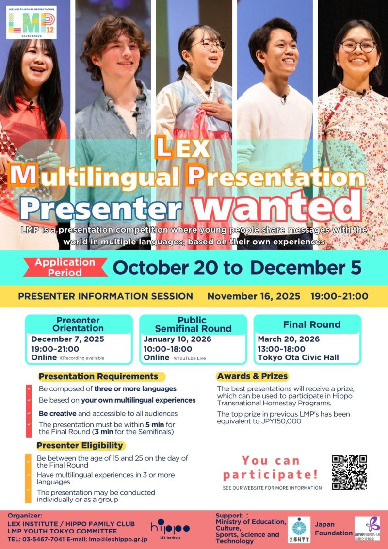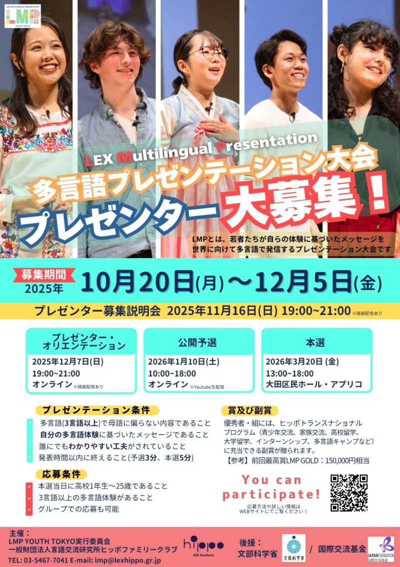 第12回 多言語プレゼンテーション大会 プレゼンター募集 たくさんのご応募お待ちしています。 予選は2026年1月10日(土)YouTubeで無料配信します。 多言語 よかったらシェアしてね! URLをコピーしました! URLをコピーしました! 今夏はマレーシア・ムスリム社会でホームステイ②〜植物〜 多国籍の子どもたちと共生している小学校では 関連記事 LMP12th予選終わりました! 2026年1月17日 英語も楽しく!多言語のススメ 講演会 2025年11月24日 思い出は話さないと忘れちゃう 2025年11月24日 多国籍の子どもたちと共生している小学校では 2025年11月24日 中学生試験期間中も多言語!? 2025年11月15日 LMP(3言語スピーチ大会)の思い出 2025年7月13日 スペイン9ヶ月間高校留学に行ったRちゃんの報告会〜2025年7月12日マルチリンガル活動〜 2025年7月13日 マサイ族の家にホームステイ体験!?〜2025年7月5日マルチリンガル活動〜 2025年7月13日
